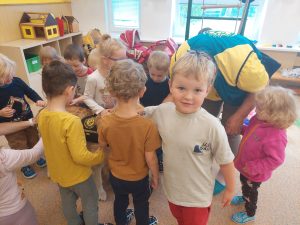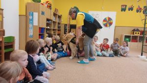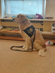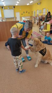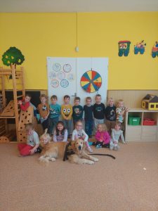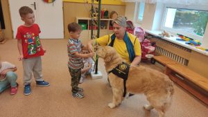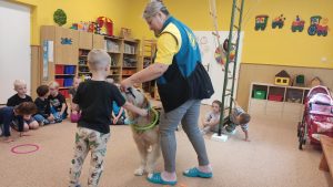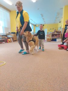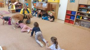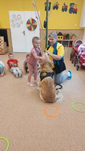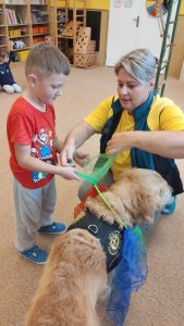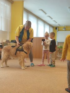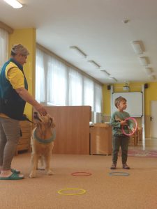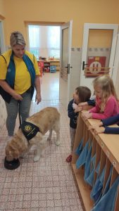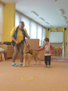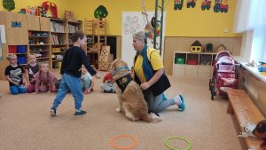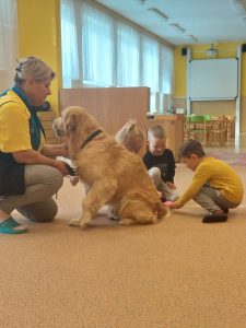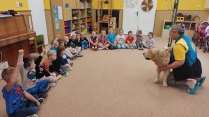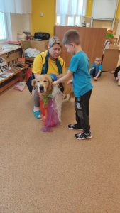 Za dětmi přišel host – canisterapeutický pejsek Amigo se svou paní Jitkou Vlaanderen. Děti měly příležitost se s Amigem seznámit, pohladit si ho a dozvědět se, jak dokáže pomáhat lidem i dětem . Pejsek byl trpělivý a plnil jednoduché úkoly. Kdo uměl lépe povel- LEHNI, ZŮSTAŇ !!