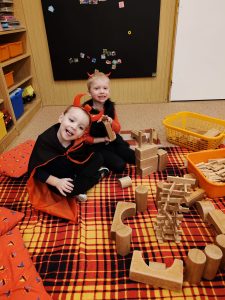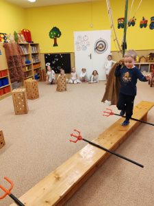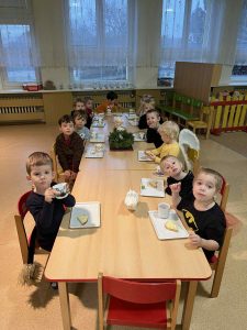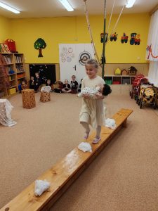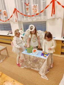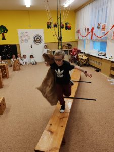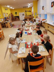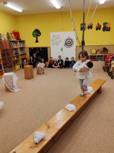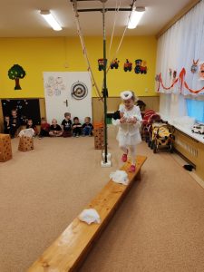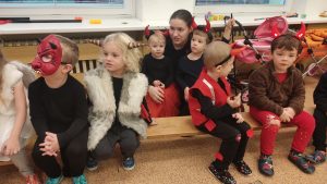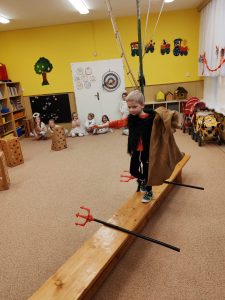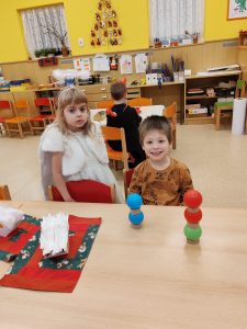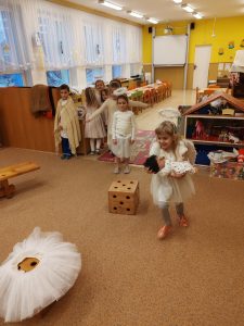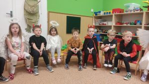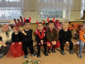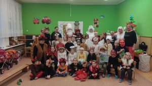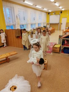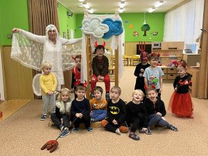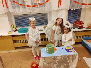 V pátek 5. prosince se děti převlékly do kostýmů čertíků, andělů a Mikuláše. Společně jsme tančili, zpívali a plnili různé úkoly, např. andílci přenášeli opatrně Ježíška mezi obláčky, čertíci probíhali lesem s pytlem nezbedů apod.