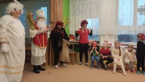 Po svačince přišla vzácná očekávaná návstěva- Mikuláš, čertí babička a anděl. Děti společně zazpívaly písničku o Mikulášovi, přednesly pár básniček a za odměnu dostaly balíček.