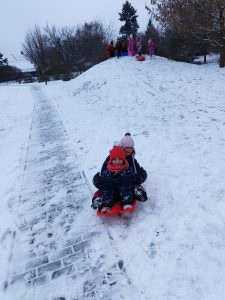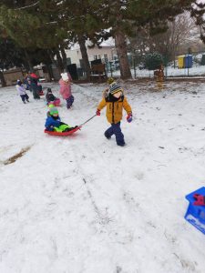 Konečně se děti dočkaly snížku. Po svačince vyběhly na dvoreček, zametaly, nabíraly sníh lopatkami a zkoušely andílka. Další den napadlo trochu více a tak jsme vzali boby, sáňky a šup na náš kopeček. Toto jede, hurá!