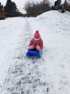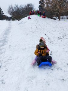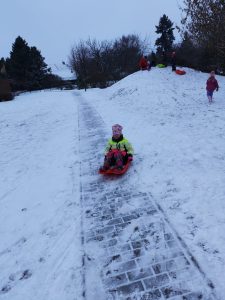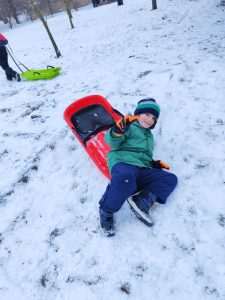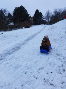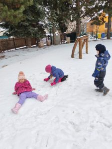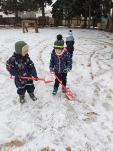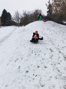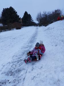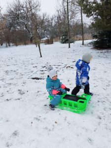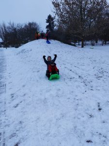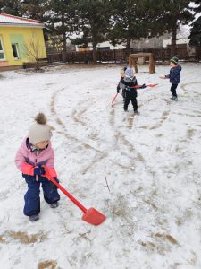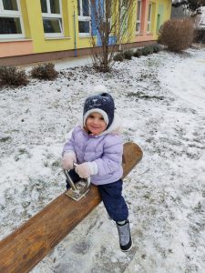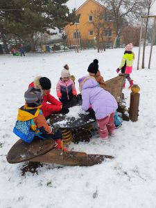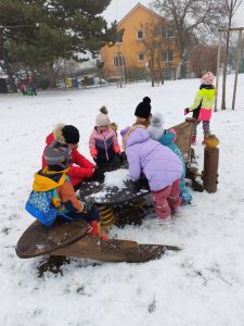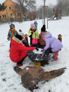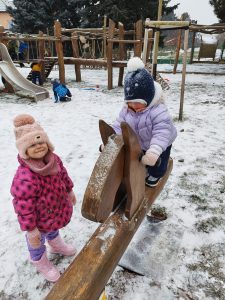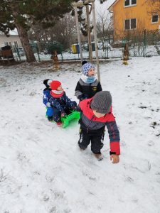 Konečně se děti dočkaly snížku. Po svačince vyběhly na dvoreček, zametaly, nabíraly sníh lopatkami a zkoušely andílka. Další den napadlo trochu více a tak jsme vzali boby, sáňky a šup na náš kopeček. Toto jede, hurá!